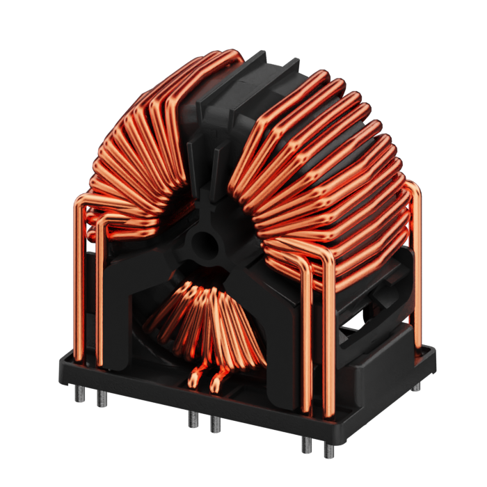 Vertical 25 A PCB three line Common Mode Choke with 1.5 mH Inductance